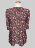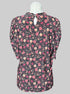 0X Anne Klein black short sleeve top with different shades of pink florals ruffle neckline, and keyhole with button on back