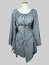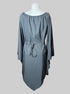 0X black, long floaty sleeve dress with attached front corset, back draw string on waist, and asymmetrical hem