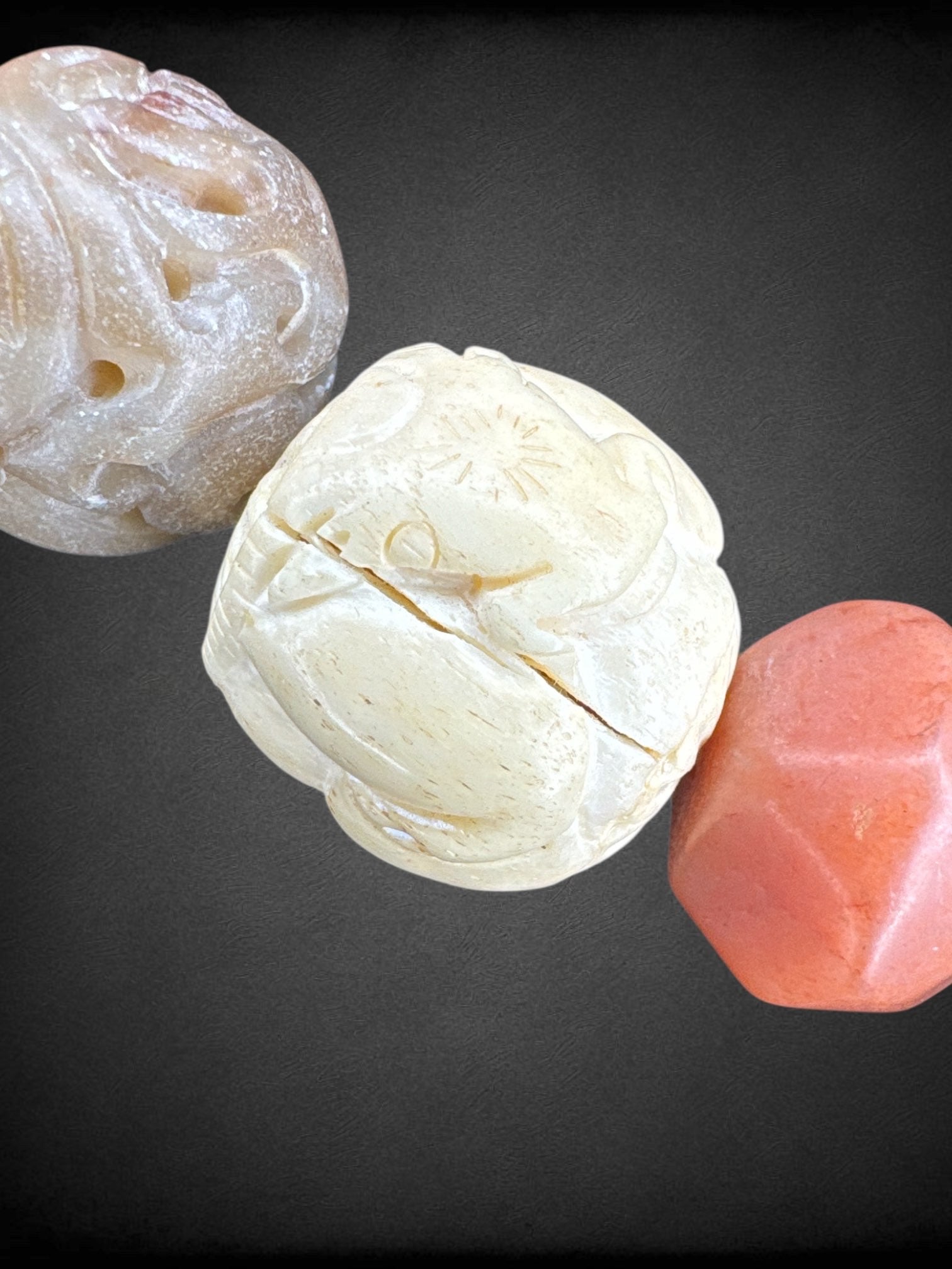 18” long Alice Kuo real gemstones, and presumed real ivory beaded necklace with animal engraved ivory beads