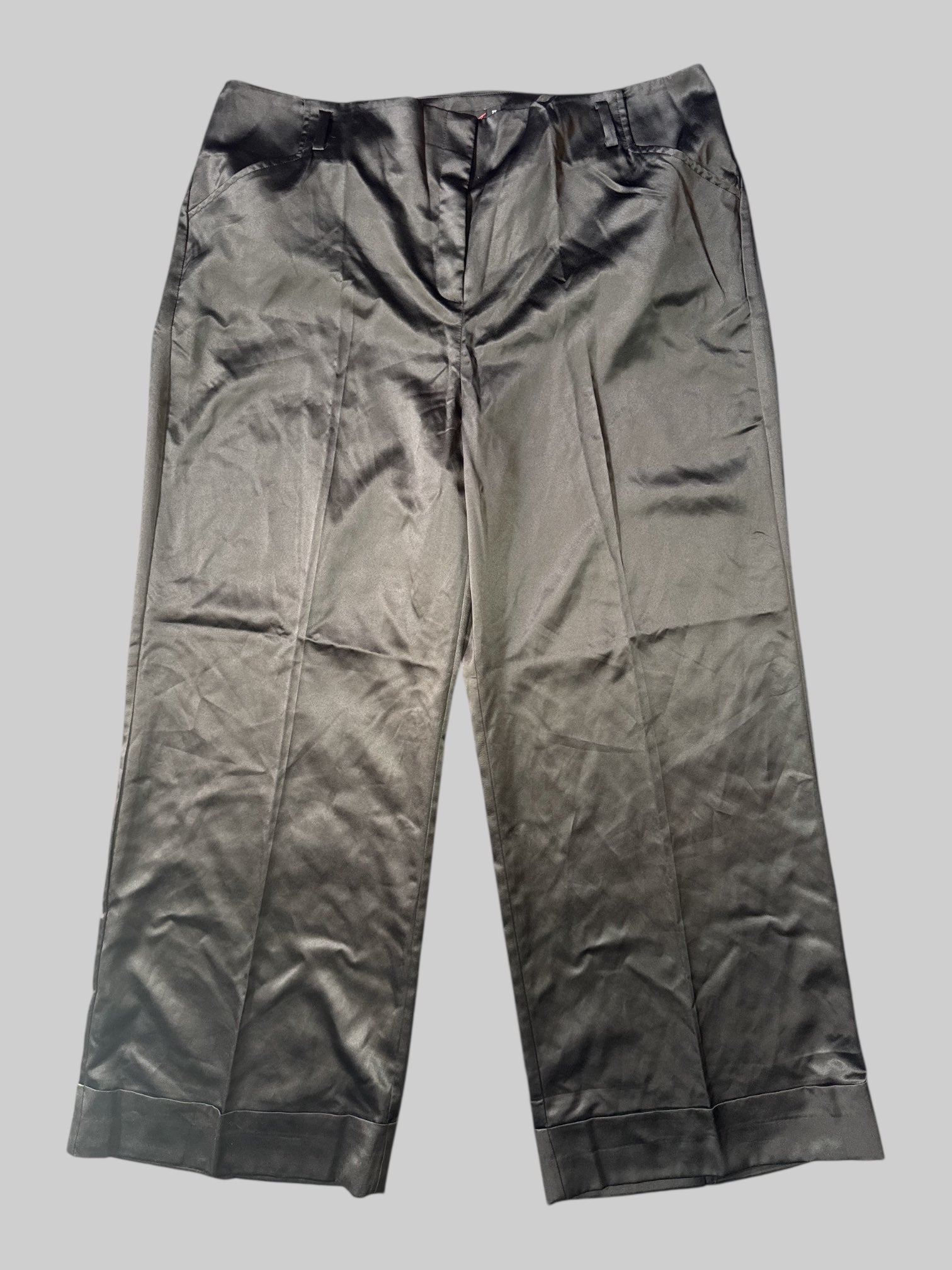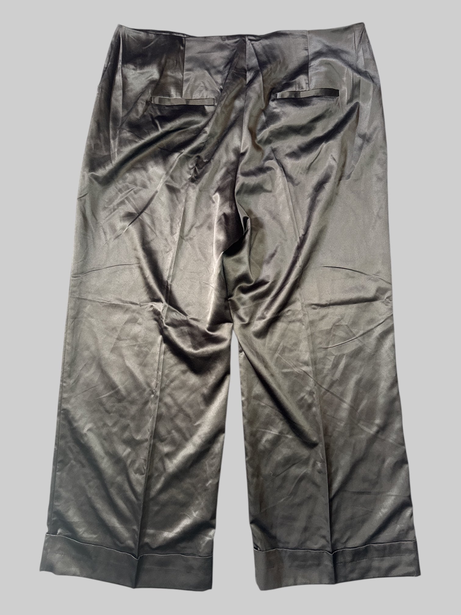 1X Black satin like pants with cuffed legs, pockets, and belt loops