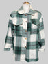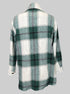 1X green, white and black plaid flannel with two front pockets and wooden buttons