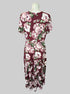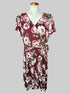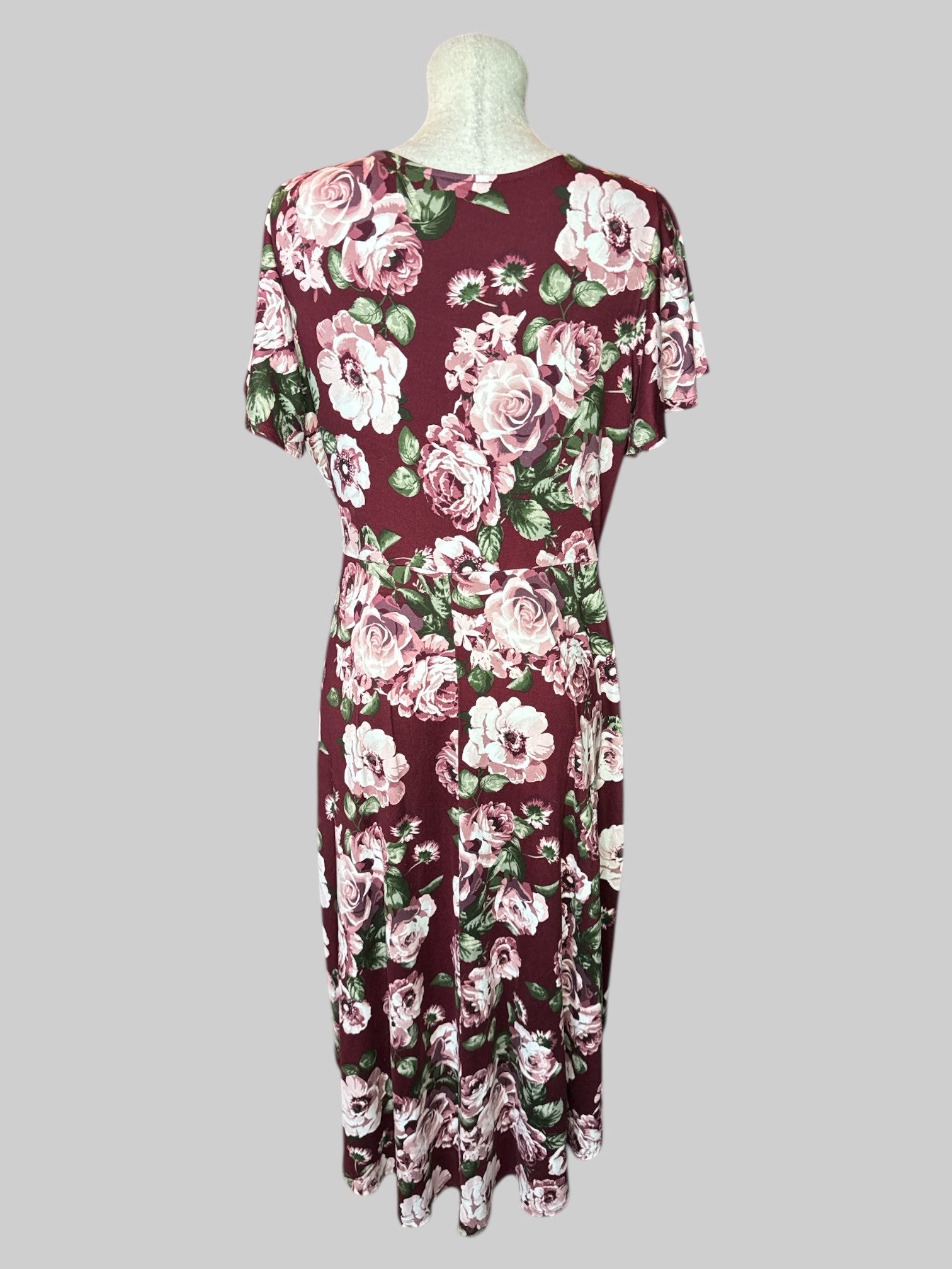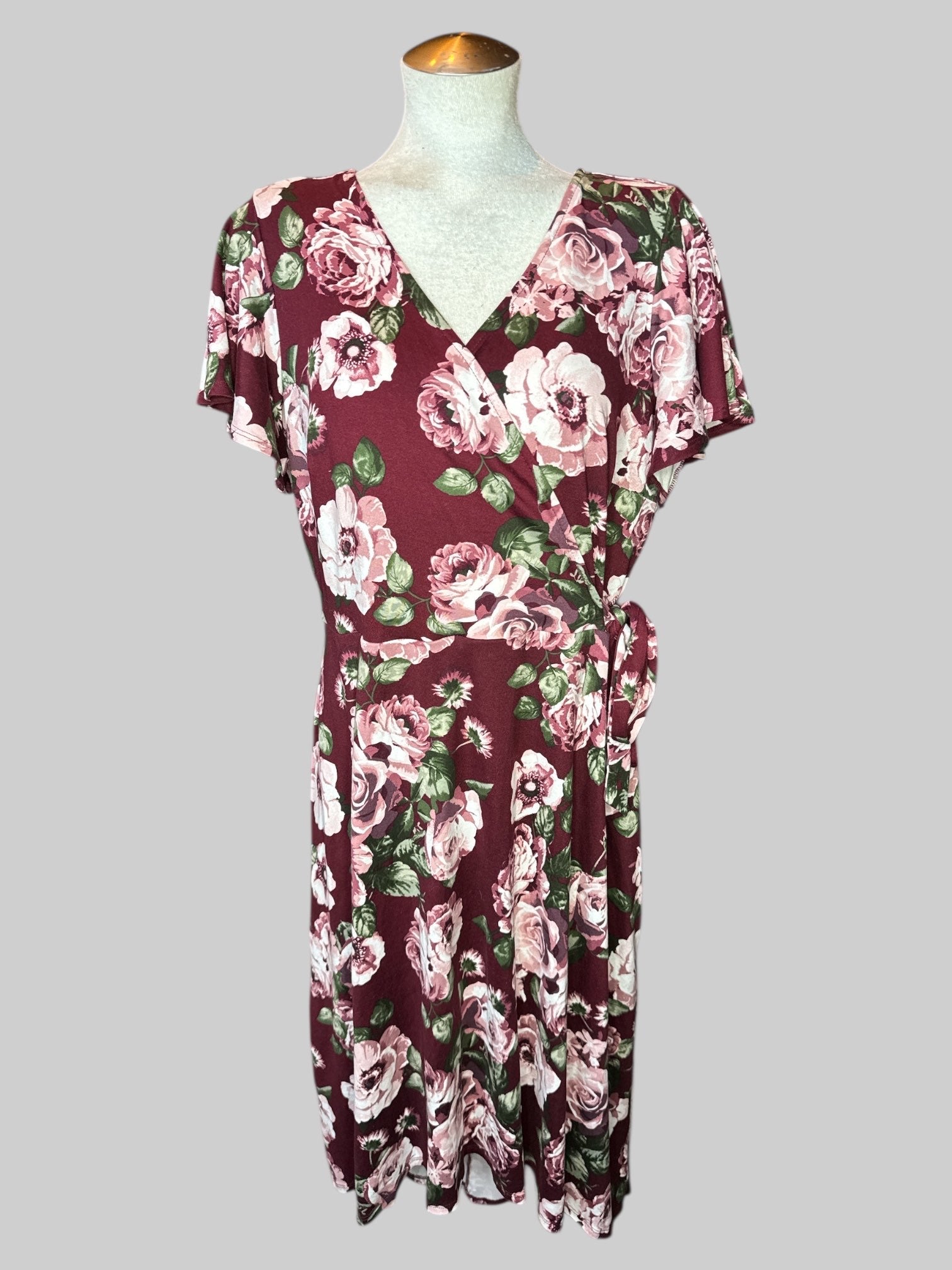 1X Maroon floral faux wrap dress with tie on front, flowy sleeves, and high low hem