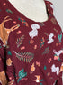 1X ModCloth maroon sleeveless fit and flare dress with deer, squirrels, and botanicals pattern with back zipper