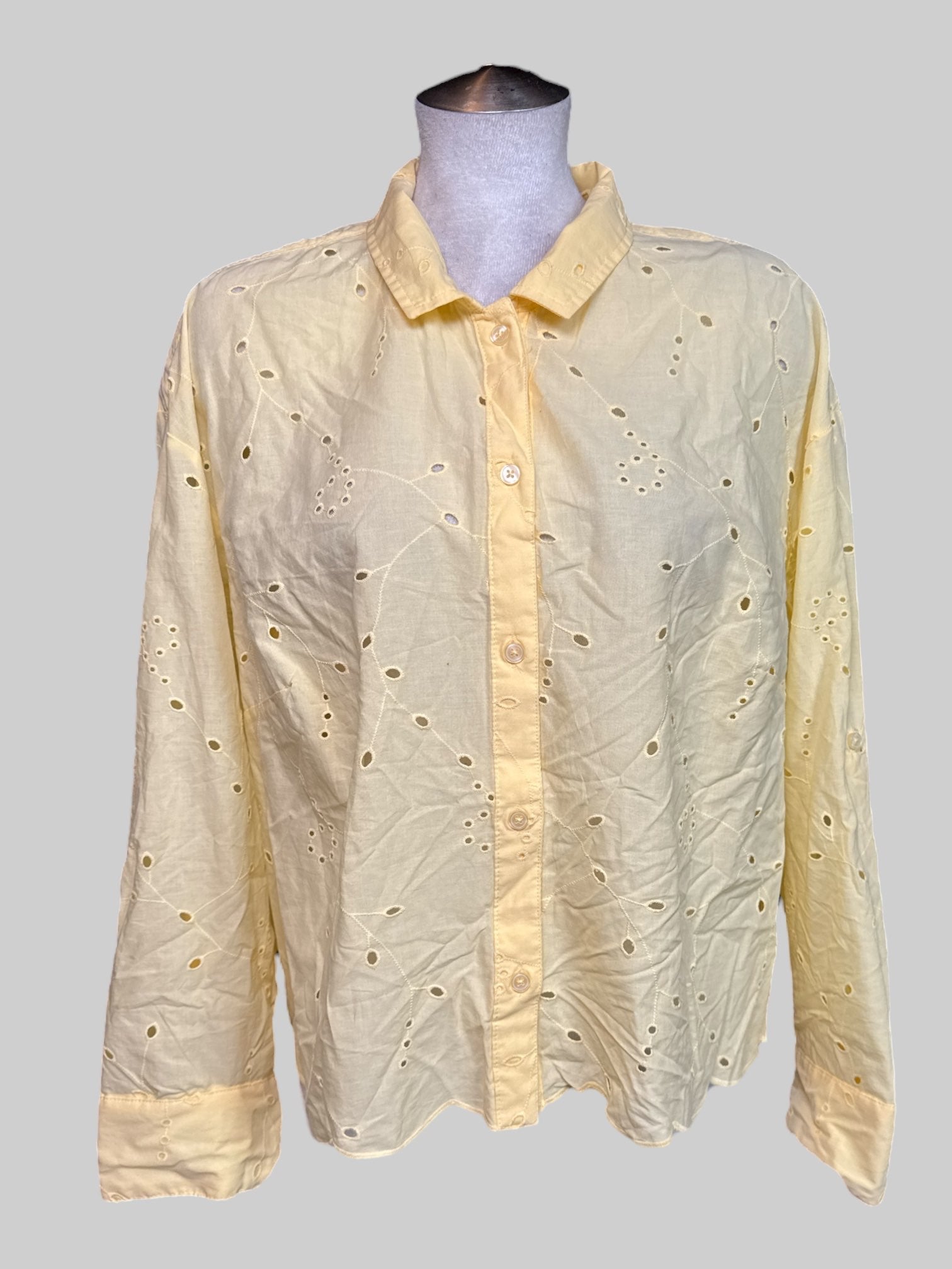 1X NWT light, yellow long sleeve button up with botanical eyelet, cut out design all over
