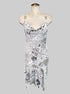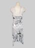 1X NWT white sleeveless dress with newspaper print, asymmetrical, hem, droopy, neckline, and metal figure eights on straps