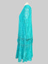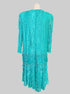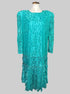 1X vintage teal tiered dress with sheer lace sleeves, shoulder pads, and beautiful florals and was made in the USA