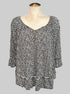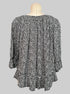 2X black and white floral long sleeve top with three buttons on front, balloon sleeves, and flowy hems