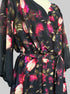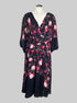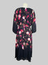 2X DKNY navy blue v-neck maxi dress with sheer long sleeves, multicolor floral pattern, and matching belt
