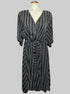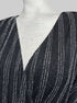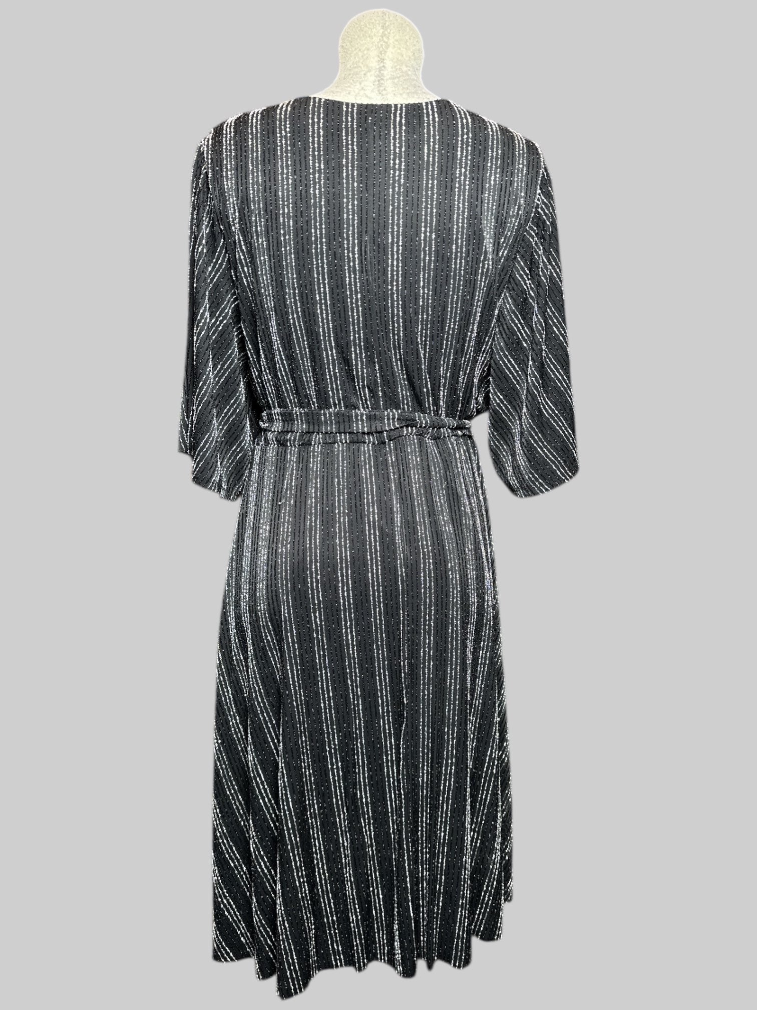 3X black faux wrap dress with black and silver metallic textured stripes and tie belt