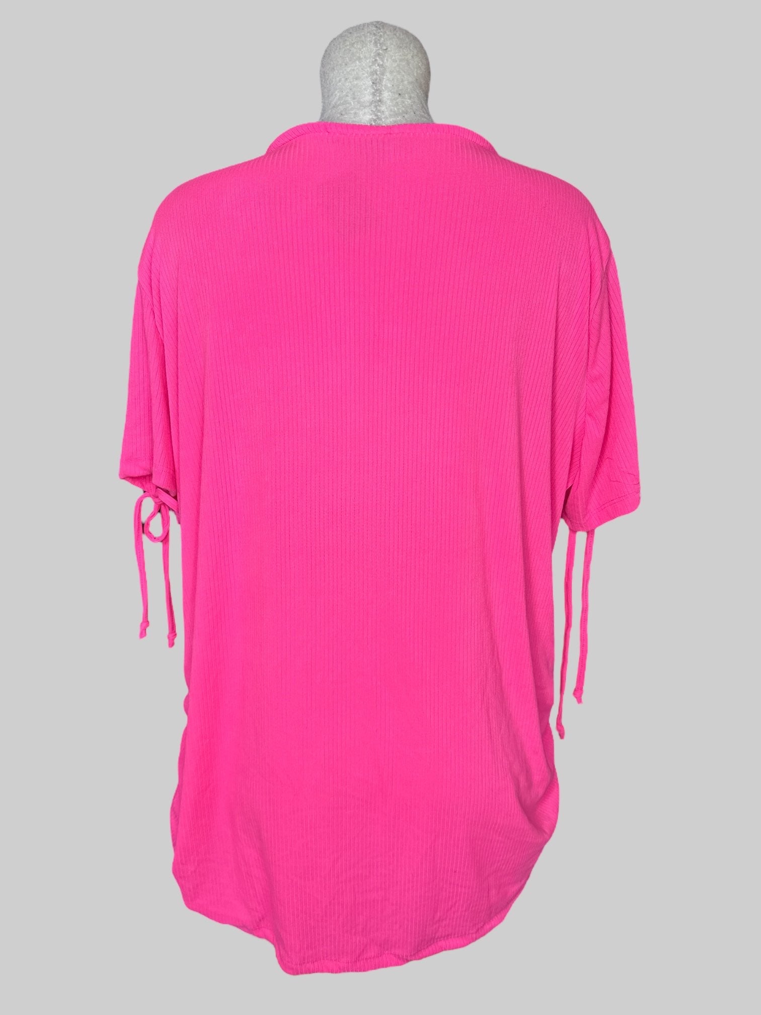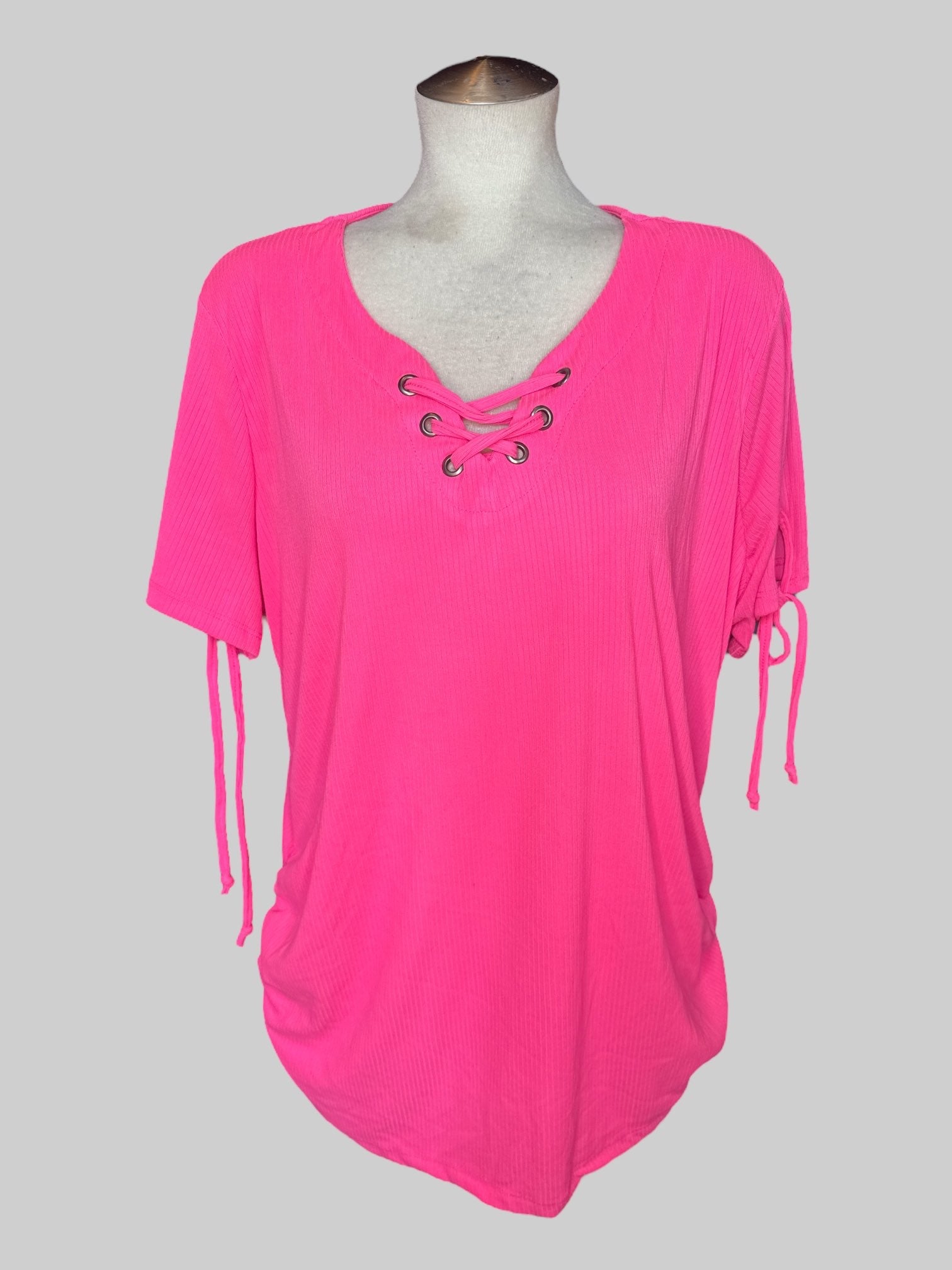 4X Pink short sleeve top with ribbed texture, lacing on neckline, cinching on sides, and ties on sleeves
