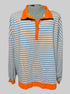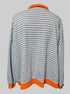 7X light, orange and blue striped long sleeve top with collar and two buttons, and orange hems and cuffs