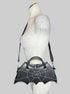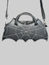 Black leather bat shaped handbag with spiderweb embroidery on front, an adjustable shoulder strap