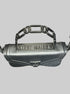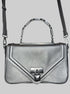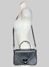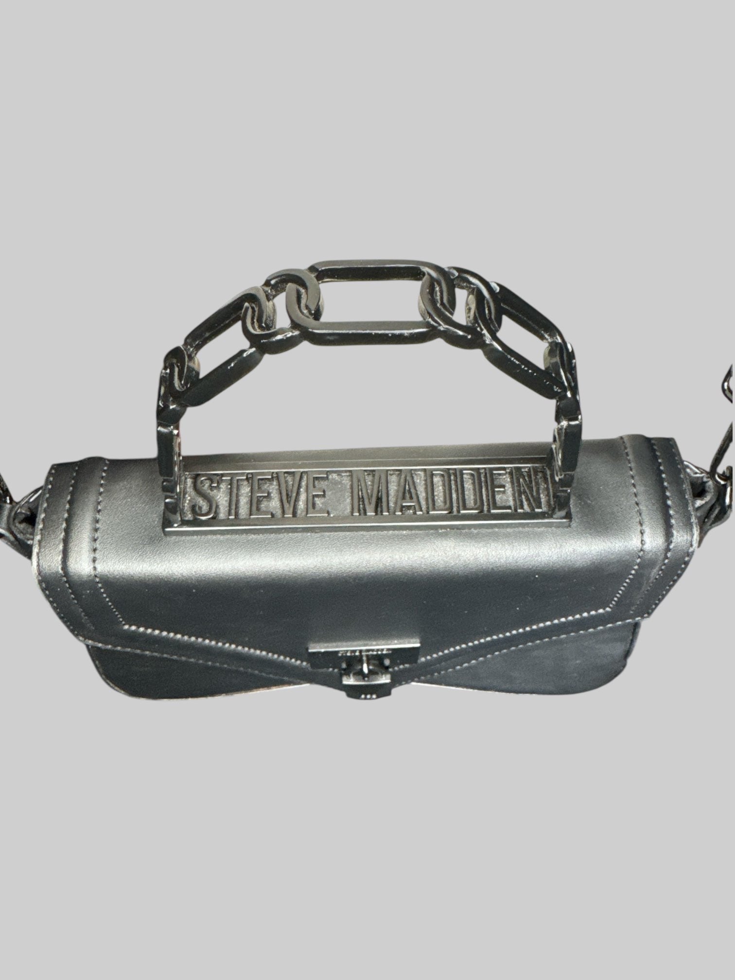 Black leather Steve Madden handbag with hard handle, shoulder strap, faux lock on front, and snap closure
