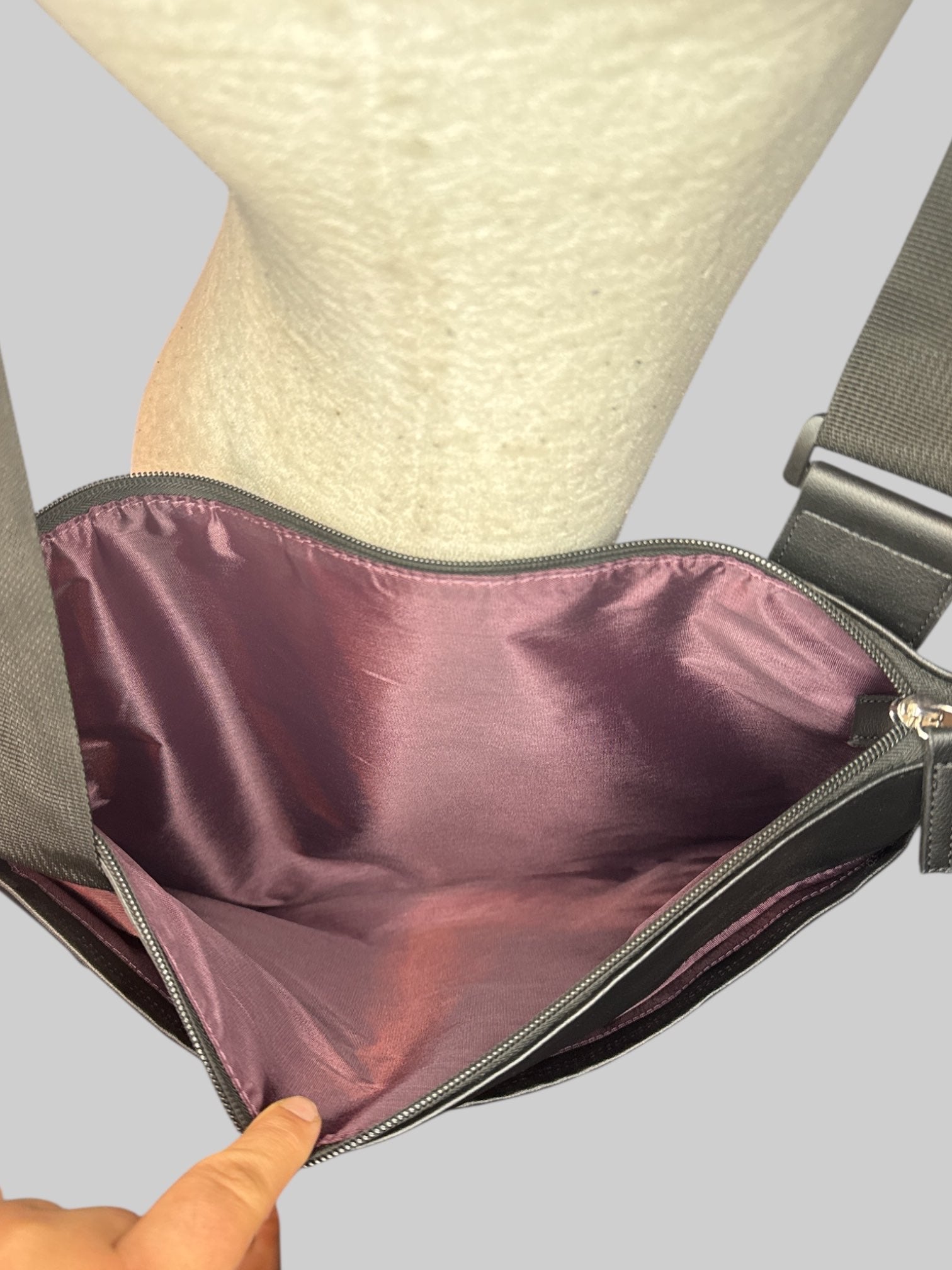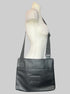 Black over the shoulder laptop bag with clear name tag slot on front, front velcro pocket, and large zipper pockets