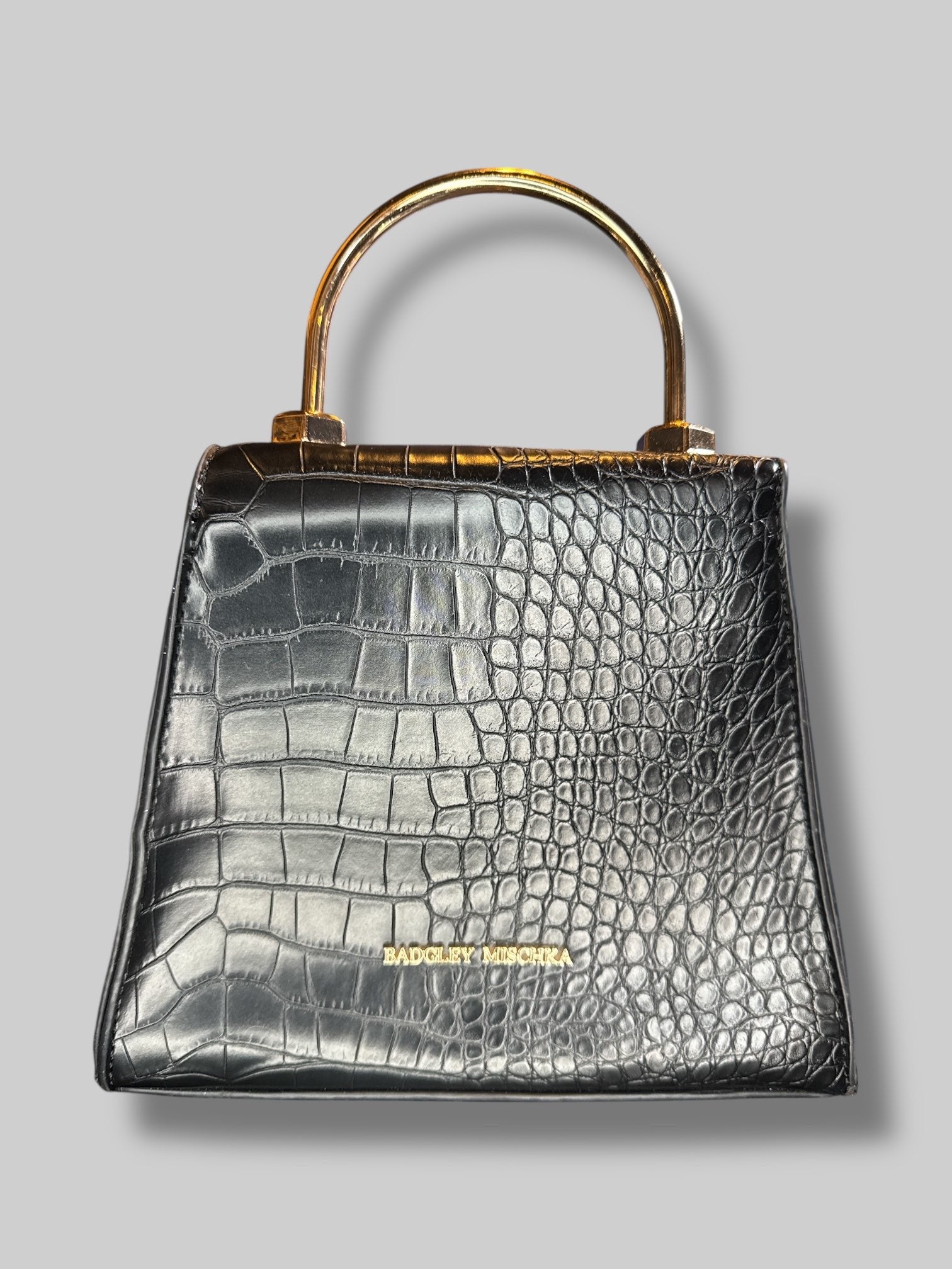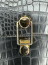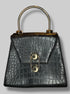 Black, small leather handbag with unique clasp, and D rings for a shoulder strap