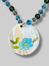 Blue, clear, and green beaded necklace with a shell flower pendant