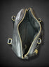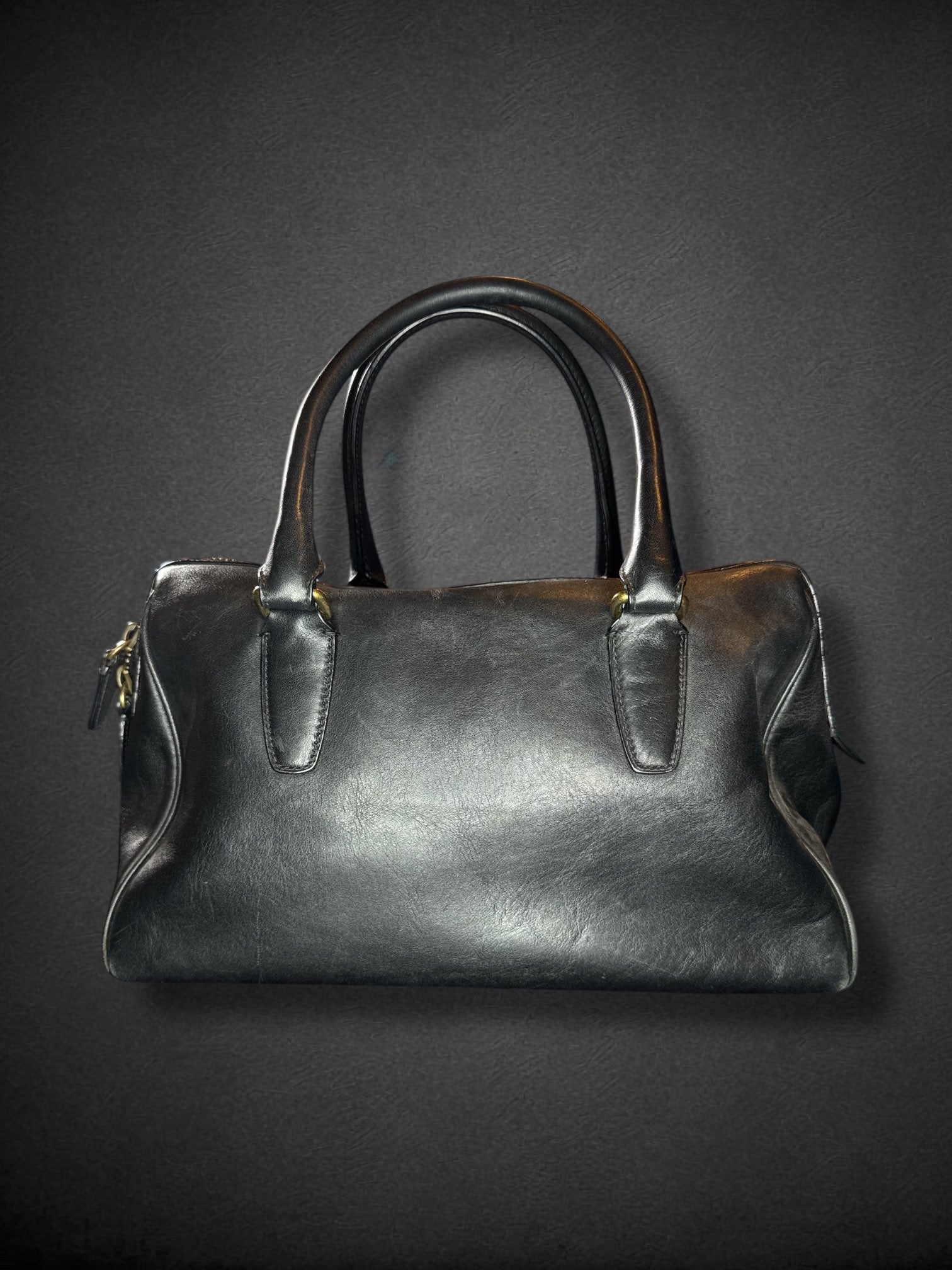 Coach black leather purse with handles, bronze studding, and large leather tassels on front