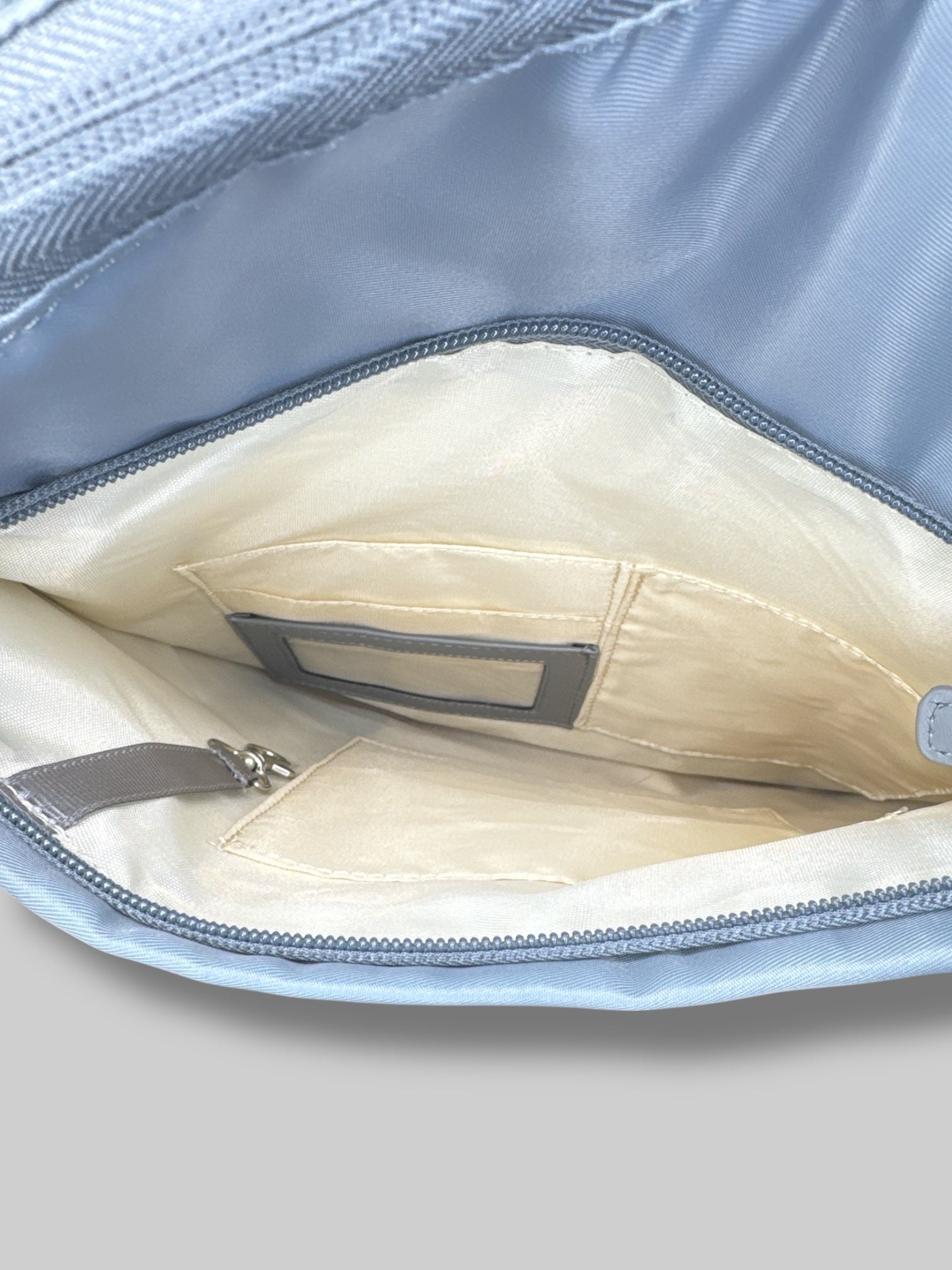 Francine Collections Silver lightly padded laptop backpack with one adjustable strap and many zipper pockets
