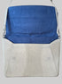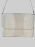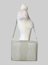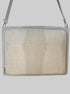 Grey leather laptop bag with shoulder strap, zipper pocket on the outside, and flip pocket