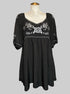 L black dress with white floral embroidery, balloon sleeves, and shirred back