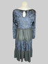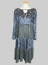 L black, long sleeve dress with balloon sleeves, velvet burnout tiered, design, and keyhole and button on back