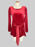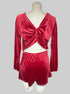 L Blue Blush red velvet romper with open back, tie in front, and elastic waistband