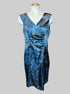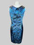 L blue, purple and black, botanical print sleeveless dress with pleated ruffle design on front and neck line, and zipper on back