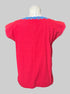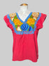 L red shorts, top with blue, yellow and brown floral embroidery on McCline, and flared sleeves
