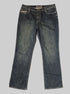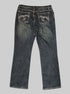 L vintage denim jeans with silver stitching, bedazzling, pockets, and belt loops