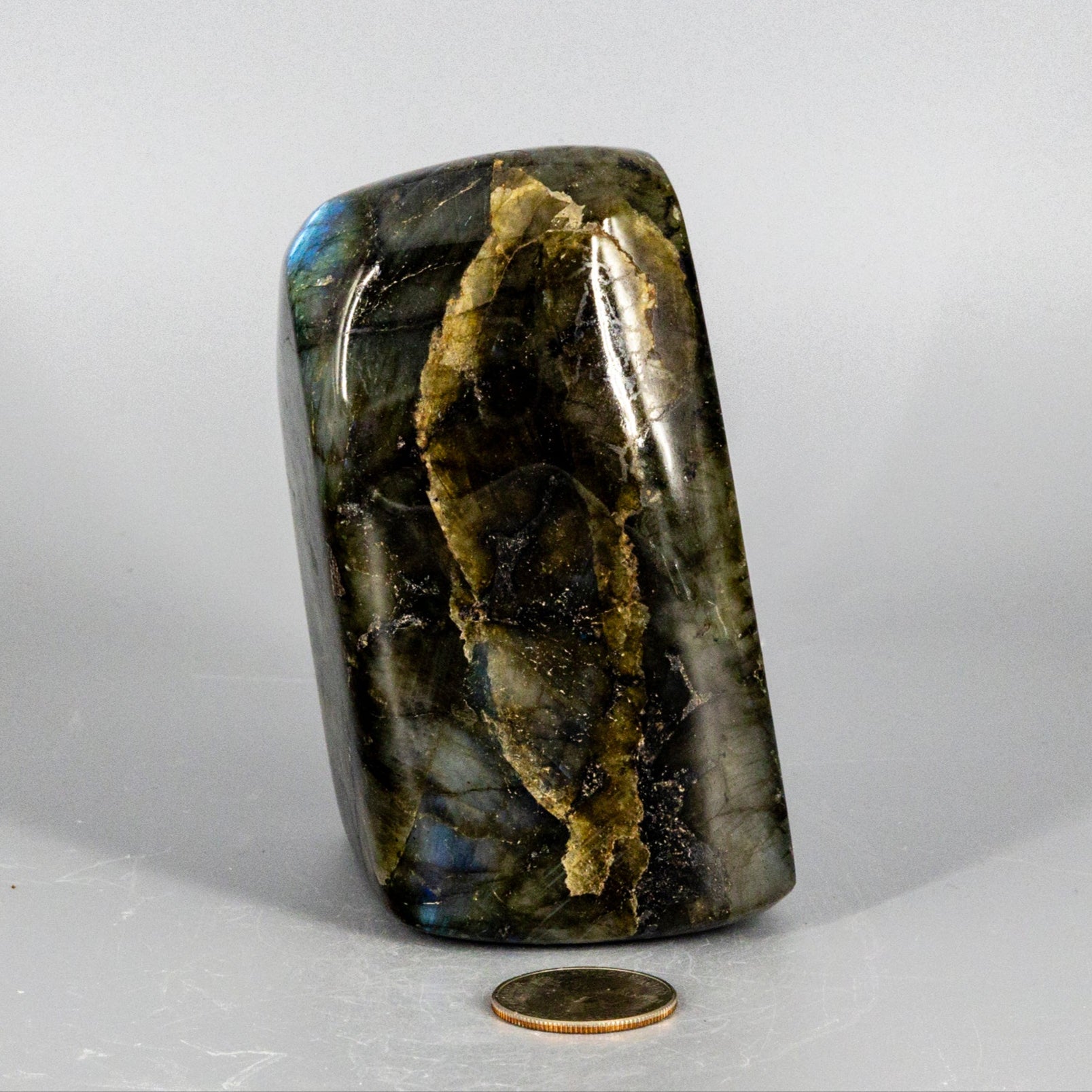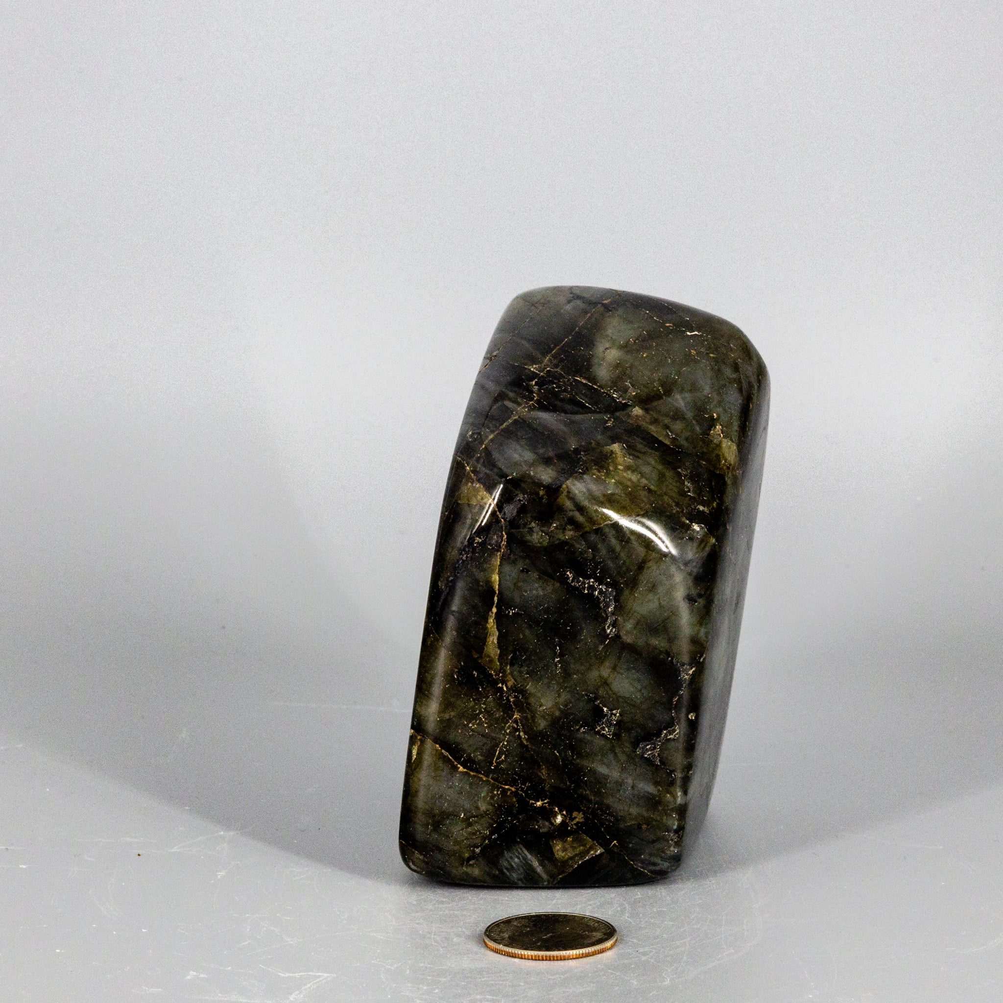 Labradorite "XL" High Flash Freeform is a striking crystal prized both for its mesmerizing visual display and its profound metaphysical qualities. This generously sized specimen reveals the stone’s characteristic iridescent flashes of blue, green, and gold, a phenomenon known as labradorescence, which makes each piece uniquely captivating. High-quality labradorite is renowned for its ability to shield the aura and protect against negativity, making it an essential tool for energy work and spiritual practices. The "XL" Freeform shape provides a large, smooth surface that enhances its luminous flashes, ideal for meditation, crystal grids, or as a captivating centerpiece in your collection.