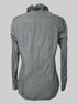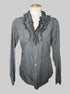 M black, long sleeve button down top with multi layer, pleated ruffle neckline