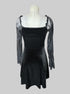 M black velvet long sleeve dress with lace off the shoulder sleeves, and two lacing sections on front