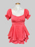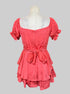 M coral, short sleeve romper with elastic, squared neckline, balloon sleeves, flowy layers, and tie on back