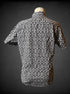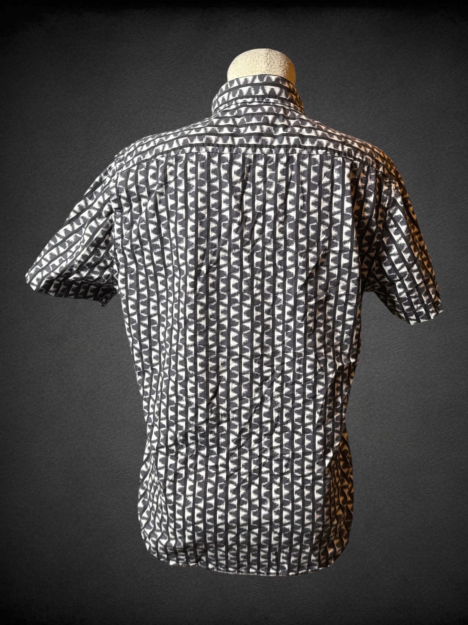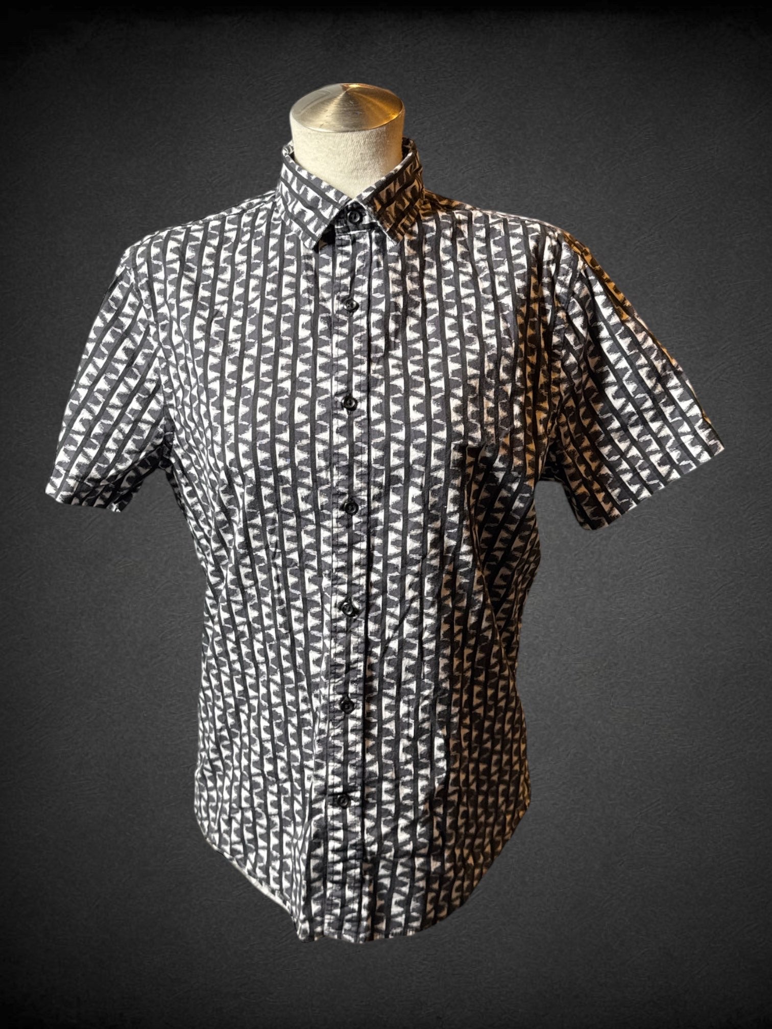 M Express navy blue, white, and black short sleeve button up with zigzag, and striped design