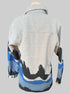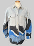 M NWT Greyish blue snap button coat with black, white, and blue pattern