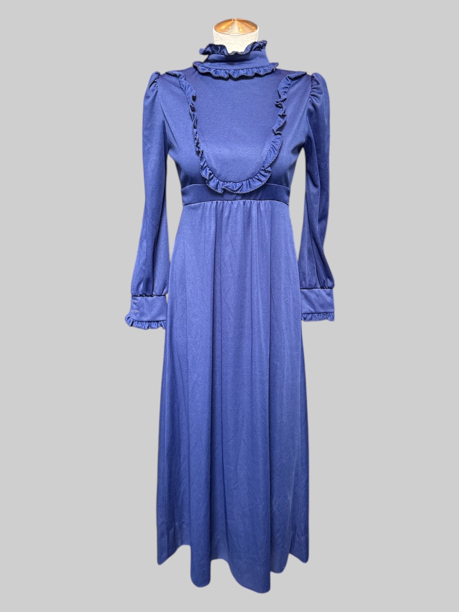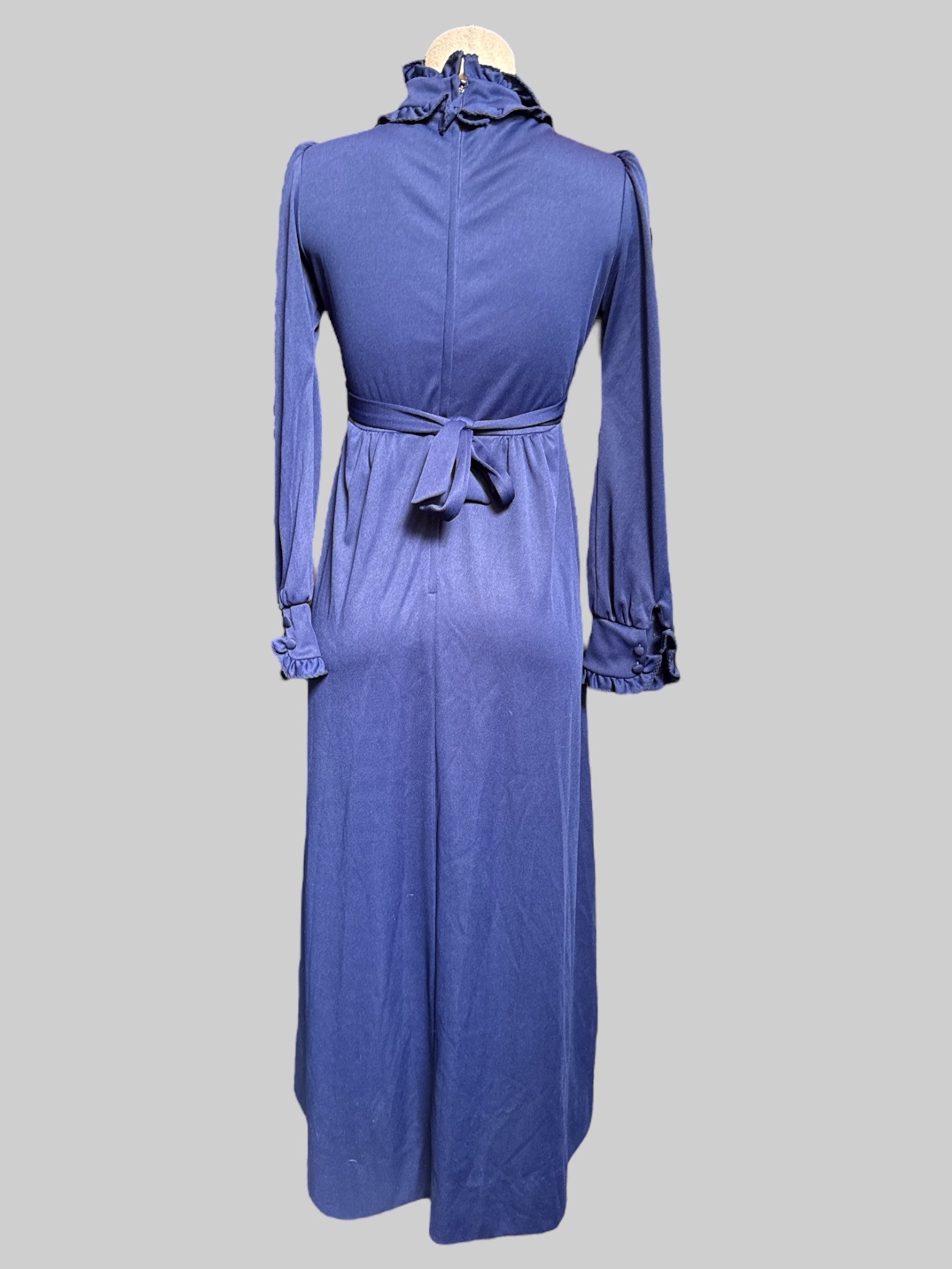 M Vintage navy blue dress with ruffles, pleating, and tie and zipper in the back