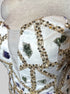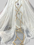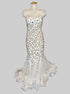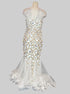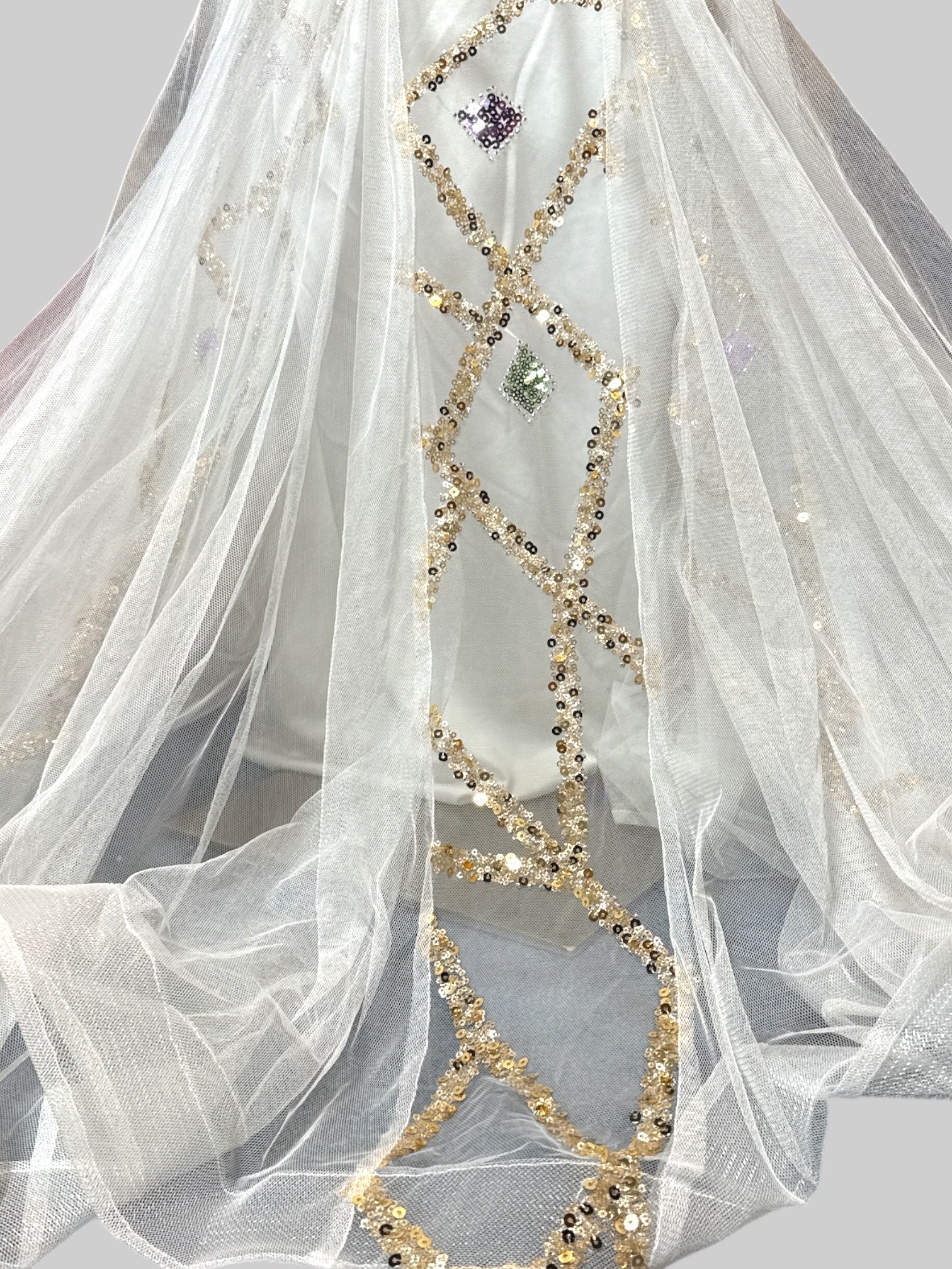 M white formal maxi mermaid style dress with green, purple, and light pink geometric sequin pattern and lots of tule