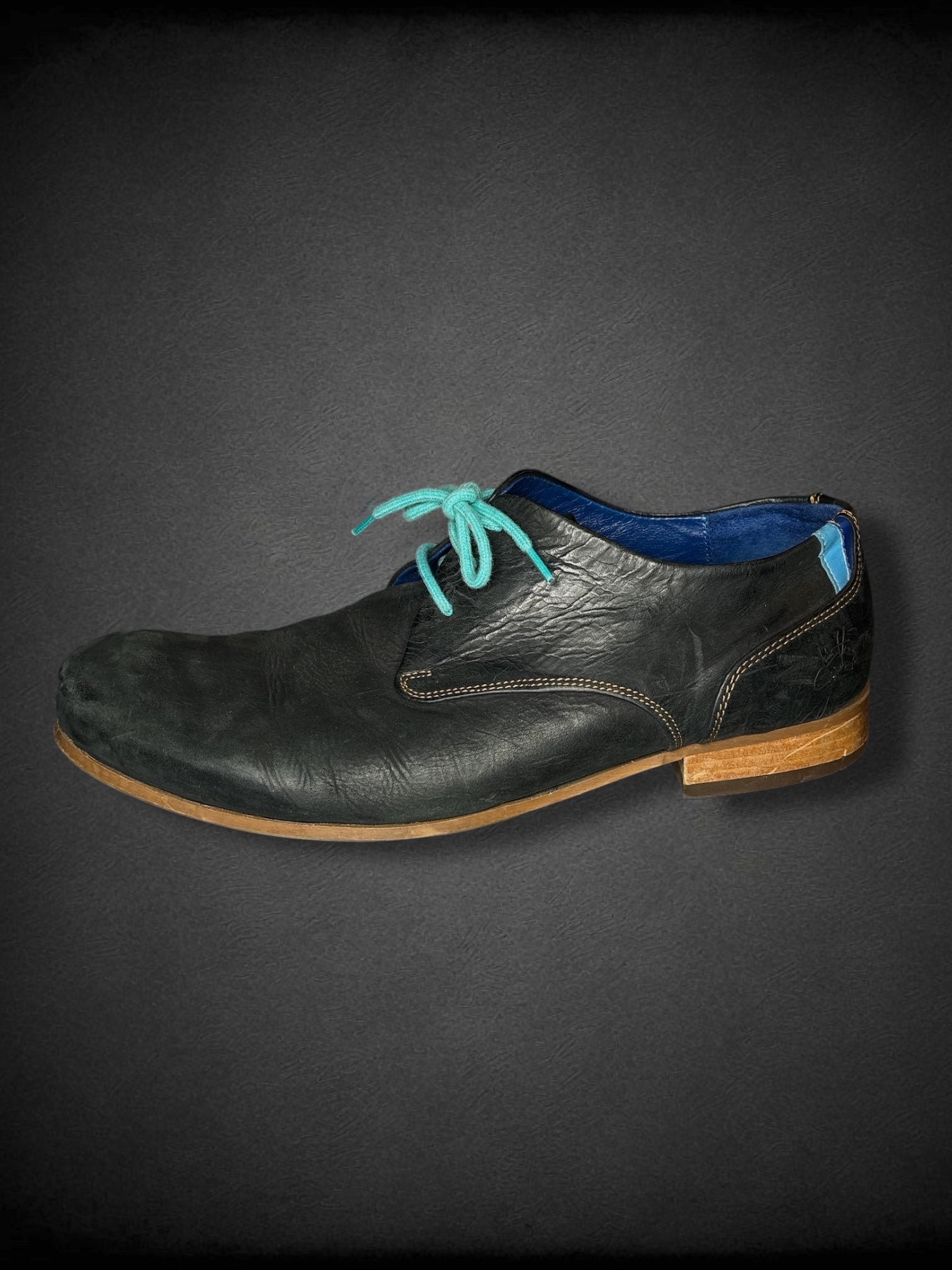 Men’s size 11M John Fluevog blue leather shoes with turquoise laces