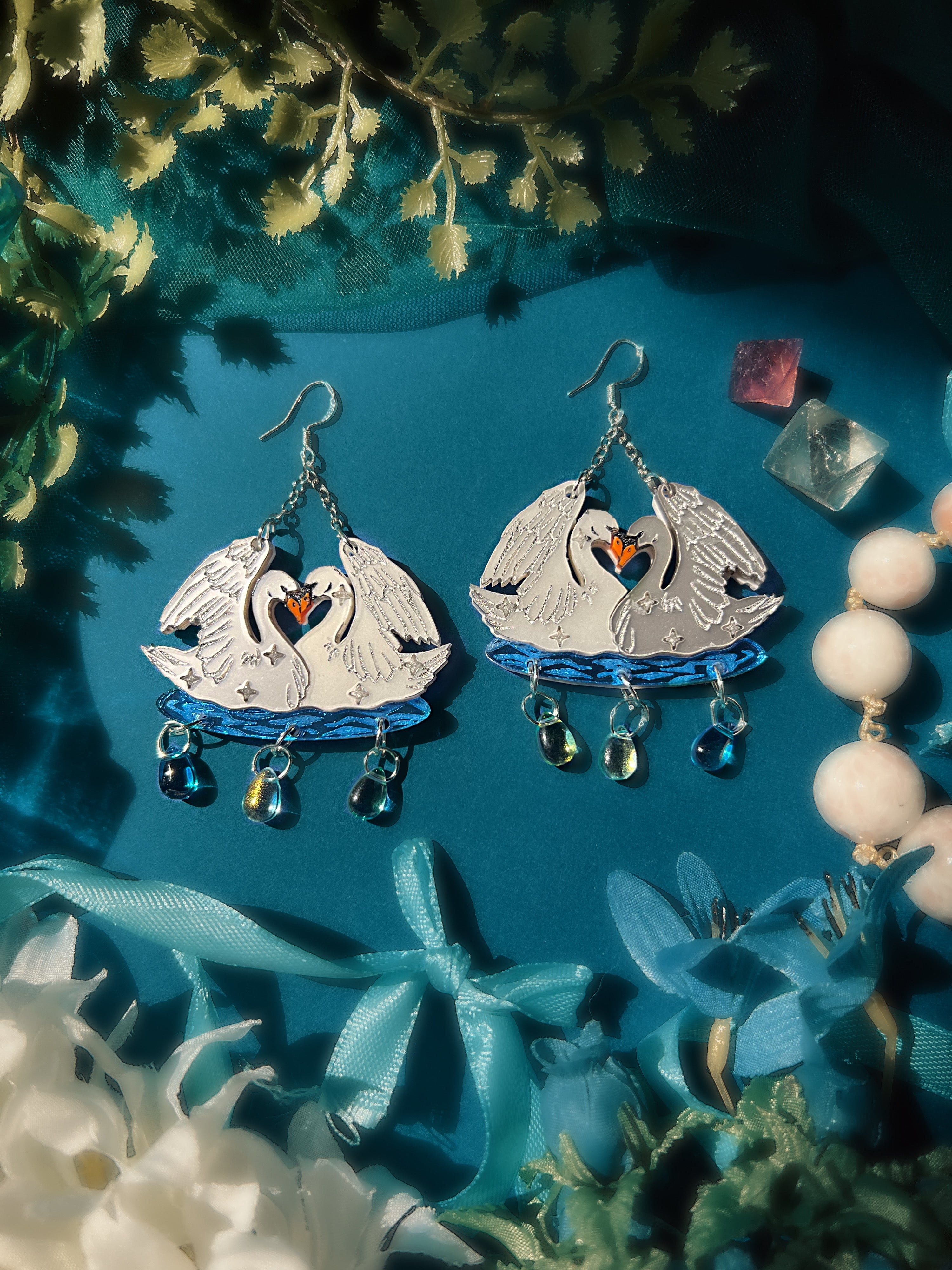 Inspired by Chappell Roan's 'Picture you' as well as Greek mythology, these earrings combine the sorrow of the song with the powerful imagery of swans. Bonded for life, but floating away on water, these swans are a reflection of love, desire and the potential heartbreak that comes from both.