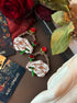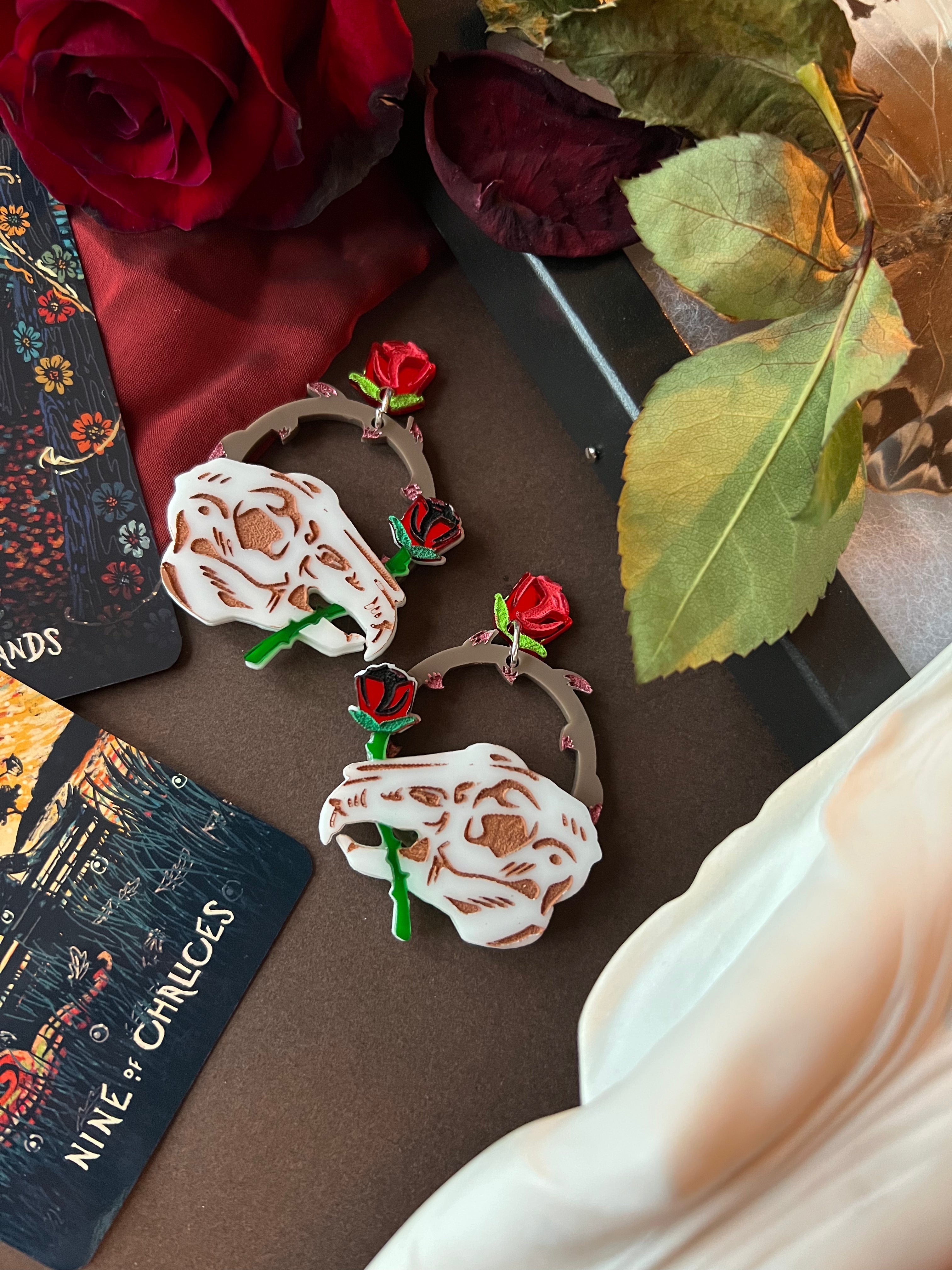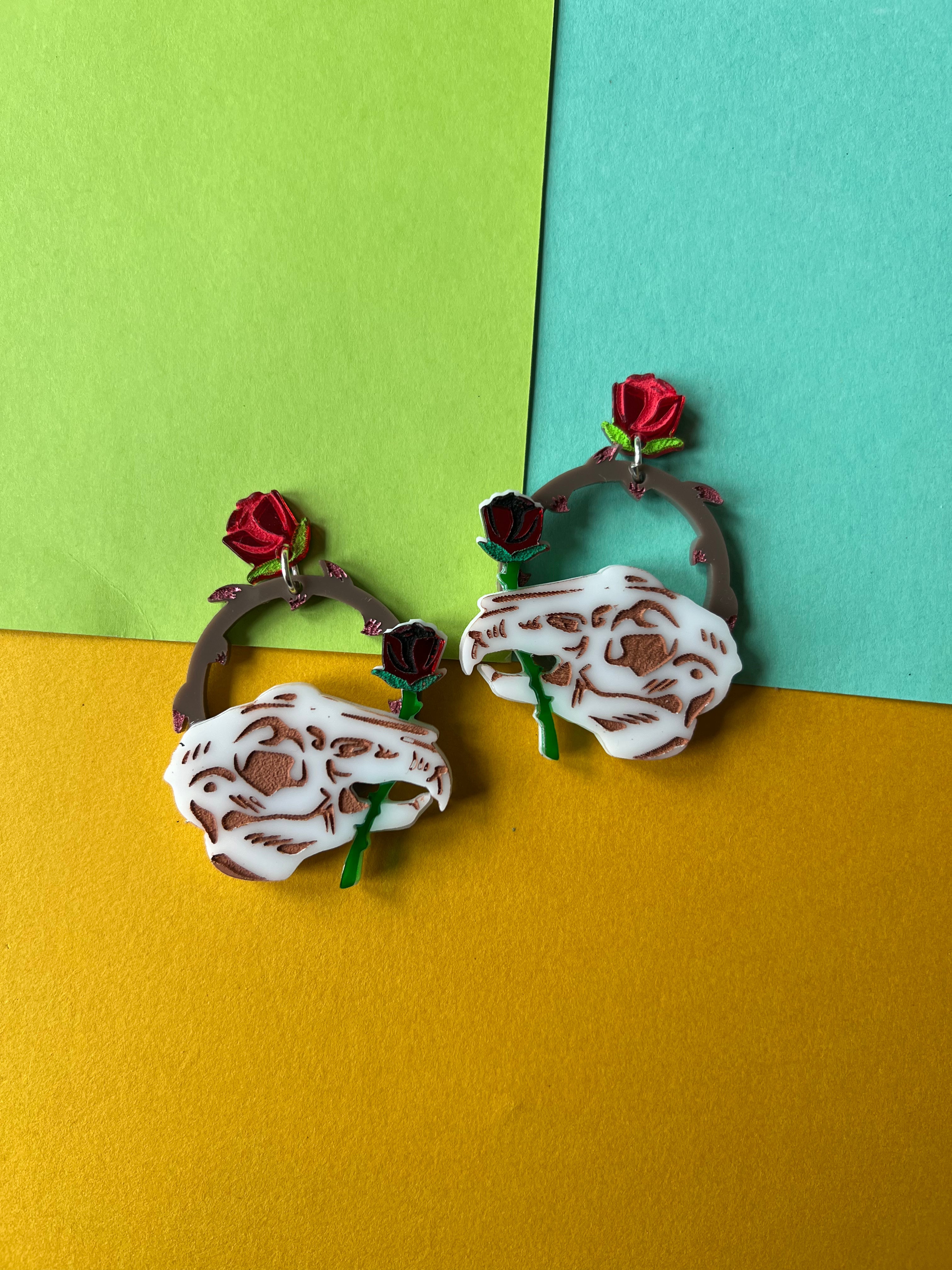 These earrings were a BLAST to make and design and y’all asked for more bones! These are another design along the ‘anti-love’ theme for Valentine’s Day! Pictured is a bunny skull amongst the roses!