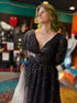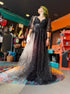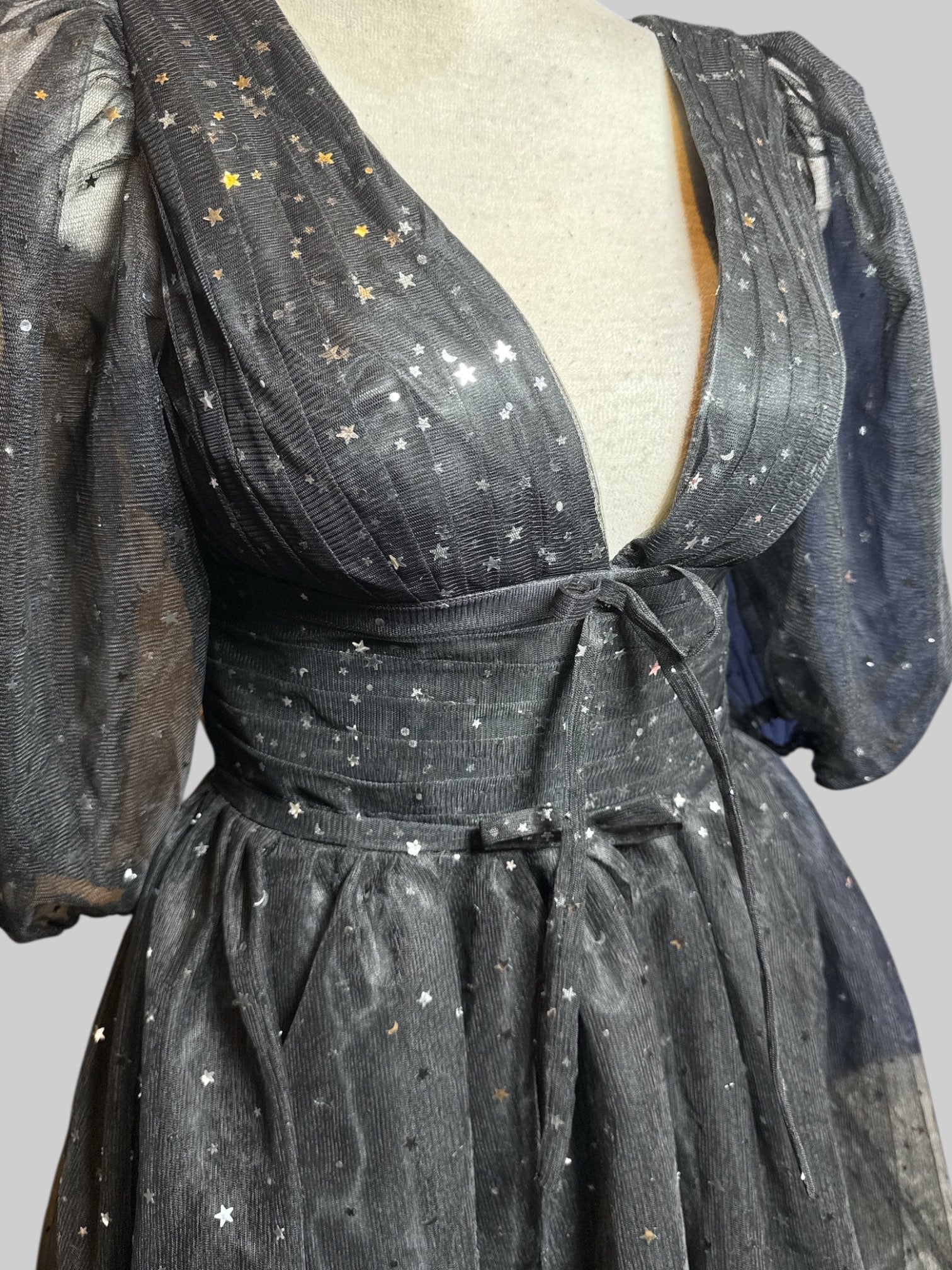 S beautiful black maxi dress with tule, celestial glitter, lace up back, and balloon sleeves