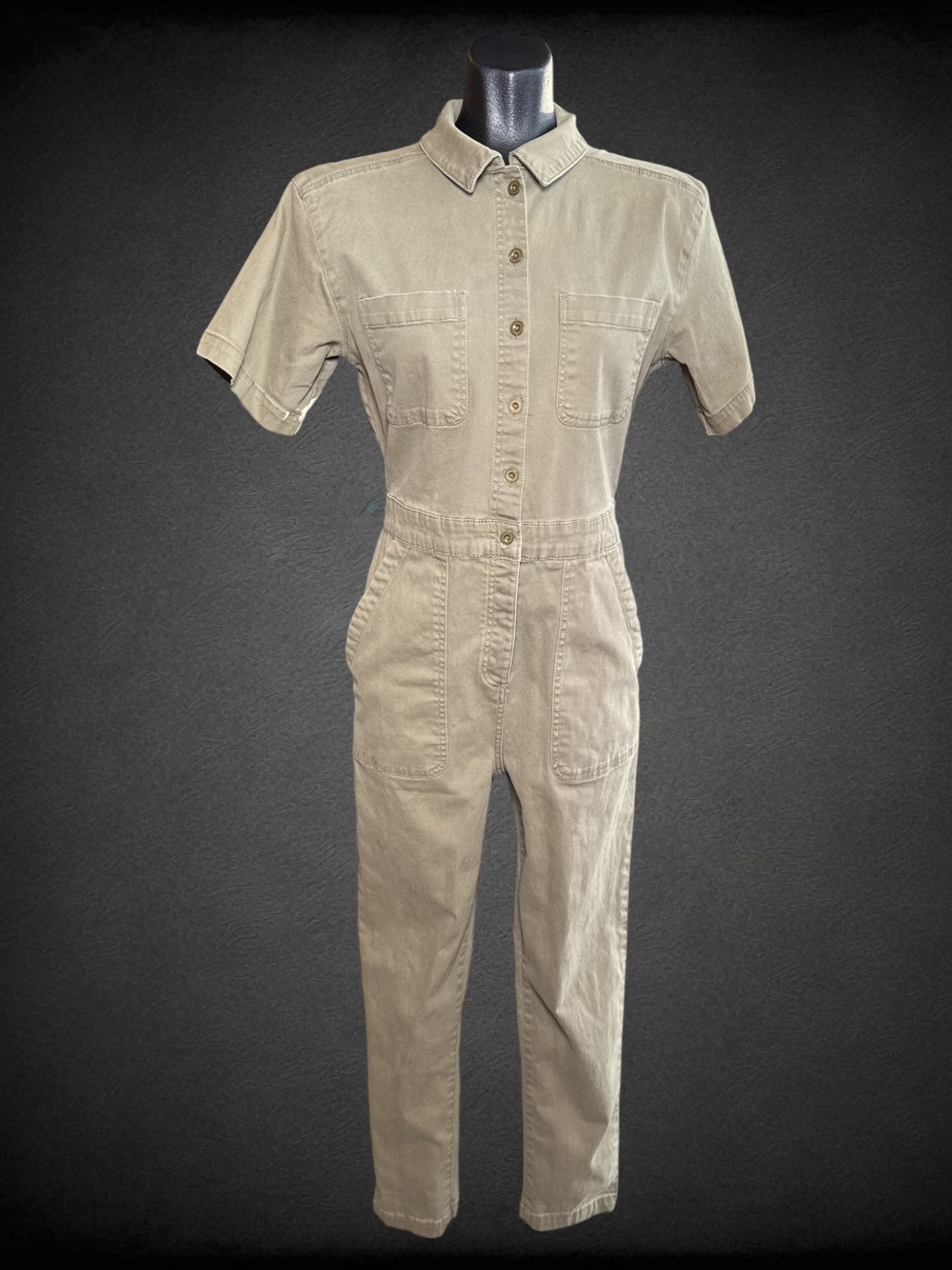 S Celebrity Pink green denim jumpsuit with many pockets, buttons closure, and elastic waist on back