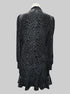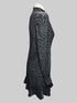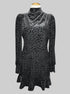 S Express black long sleeve dress with black velvet burn out leopard print, pleated right shoulder, and ruffle hem