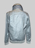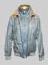 S Superdry black fleece lined zip up jacket with blue accents, zipper pockets, and multiple snap buttons
