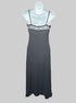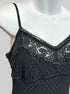 S vintage Betsey Johnson black slip dress with textured polka dots, lace chest with black roses, and velvet trim