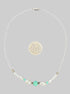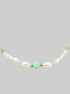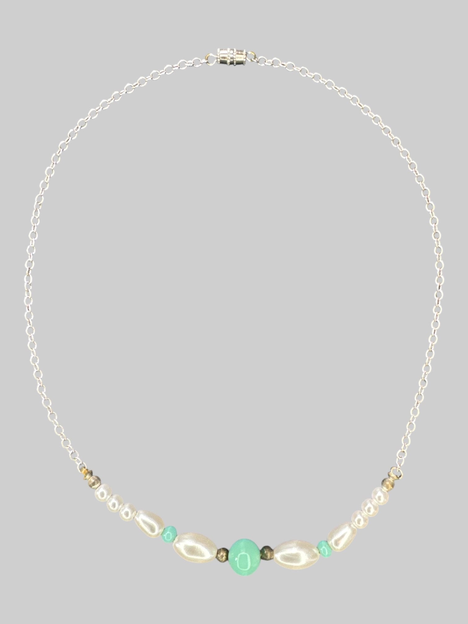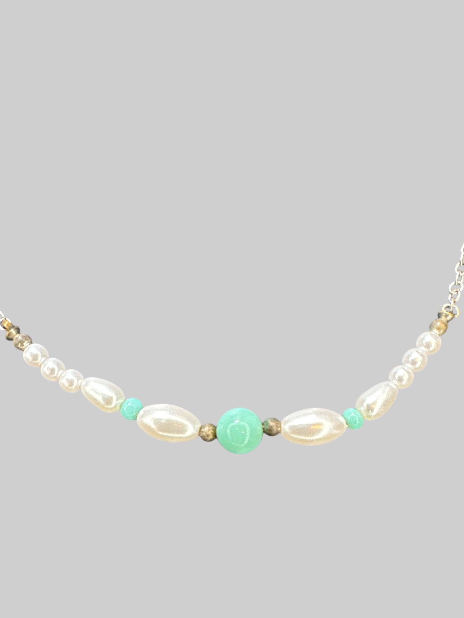 Small silver tone chain choker with screw clasp, and faux pearl and turquoise beaded pendant