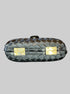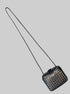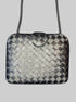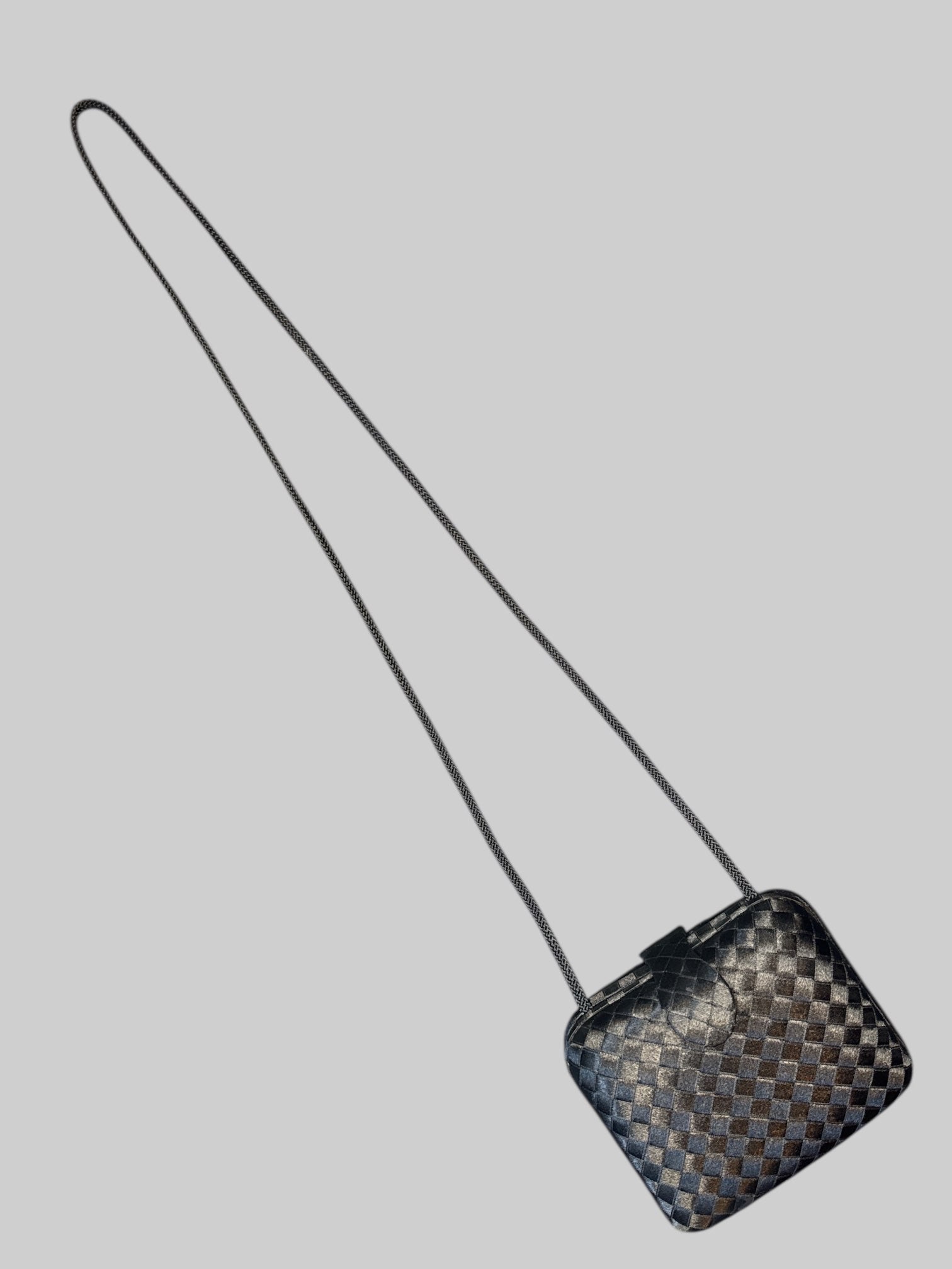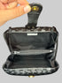 Vintage black woven purse with braided shoulder strap, snap button claspe, and multiple pockets
