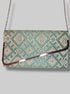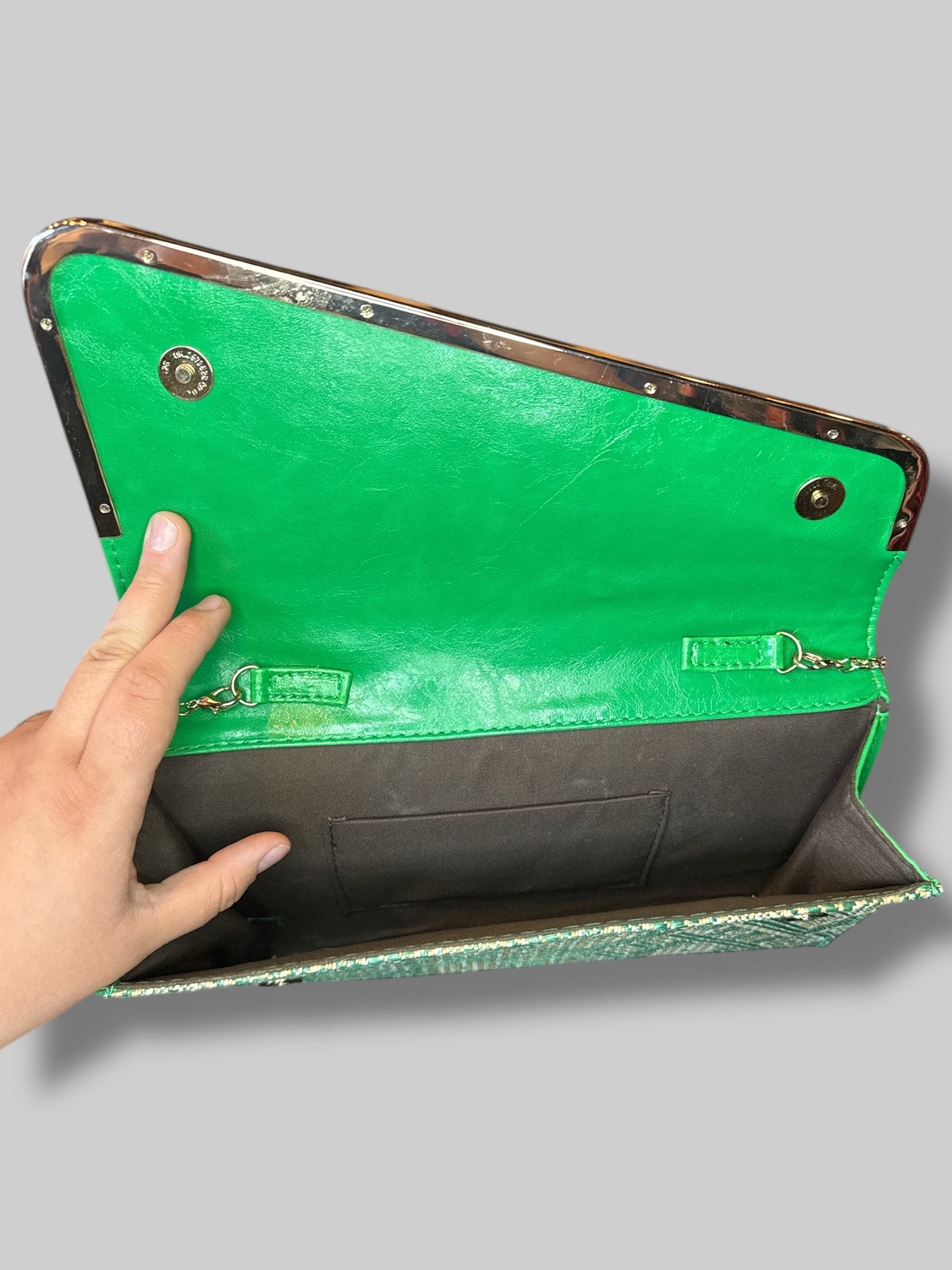 Vintage Green woven geometric design purse with chain strap, snap buttons, and pockets inside