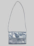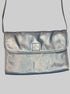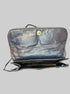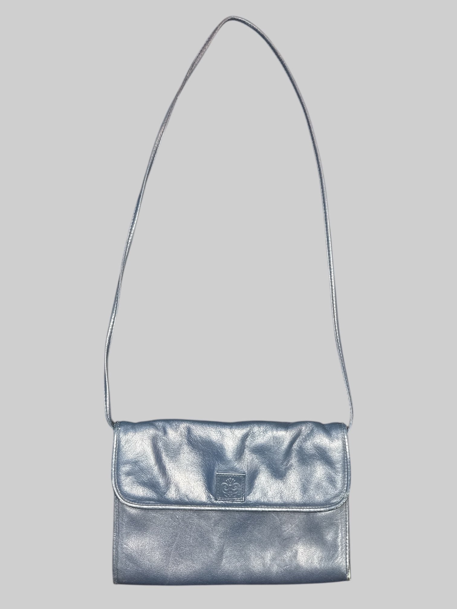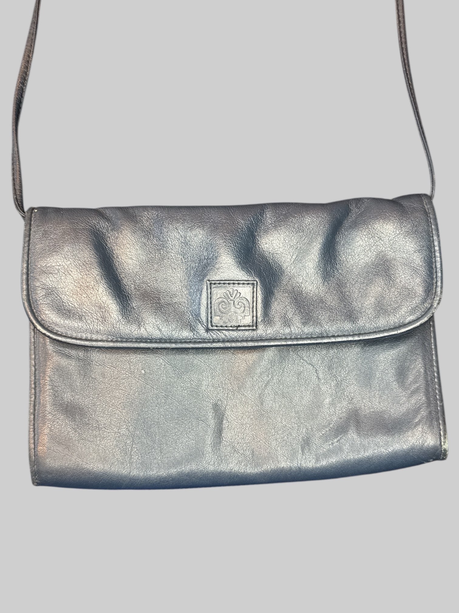 Vintage navy blue leather purse with strap, and zipper pocket on inside