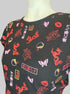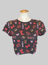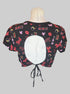 XL black crop top with red, pink, and yellow graphics, open back, and tie